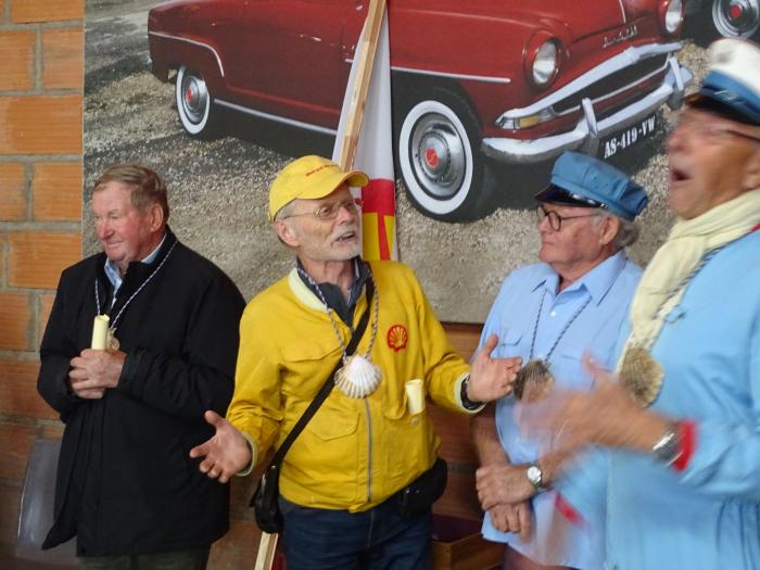 - Discrètement, Yves porteur du drapeau de la Confrérie, en fait les couleurs jaune et rouge de Shell, Christian Laronze, d’un coffret au fond duquel apparaît un pistolet de pompe à essence, Pascal Vallade, de deux parchemins enroulés, les diplômes, Patrick Chifflot, d’un vieux grimoire, les statuts de la Confrérie, Joël Criard, d’un bidon de Esso contenant un fond de vin blanc, Marc Cyrot, de deux colliers desquels tombent deux coquilles Saint Jacques), se regroupent dans la travée de gauche, habillés en pompiste et portant autour du cou un cordon sur lequel est acrochée une coquille Saint Jacques représentant la marque Shell.