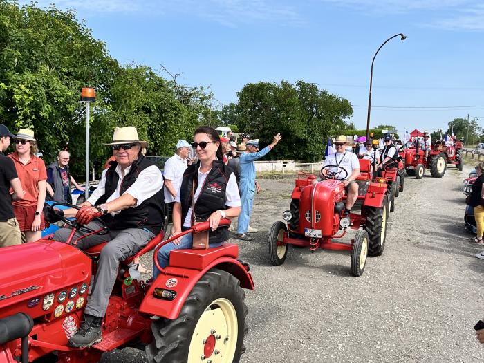 C'est une véritable meute de 12 tracteurs qui sont arrivés, drapeaux tricolores au vent et familles juchées sur les sièges ! au milieu d'une double haie de spectateurs enthousiastes!
