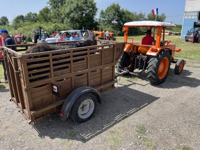 Jean Baptiste est venu en voisin avec son tracteur mais aussi avec sa bétaillère d' époque. Mais la surprise était à l'interieur avec Biscotte, son fidèle âne depuis 33 ans!!