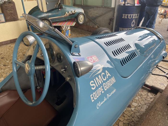 Le Président a ensuite dévoilé la perle rare de la journée: la Simca Gordini Monoplace (ex Claude Picasso petit fils du peintre) dans un état remarquable, accompagnée de sa copie,  modèle à pédales).