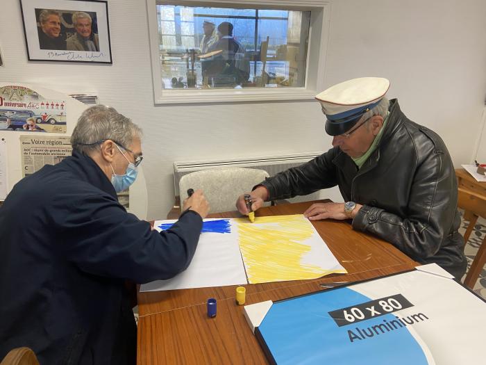 Cherchant désespéremment un drapeau ukrainien afin de rendre hommage à ce peuple  qui souffre actuellement, deux "petites-mains" s’échinaient à colorier un drapeau sur papier....