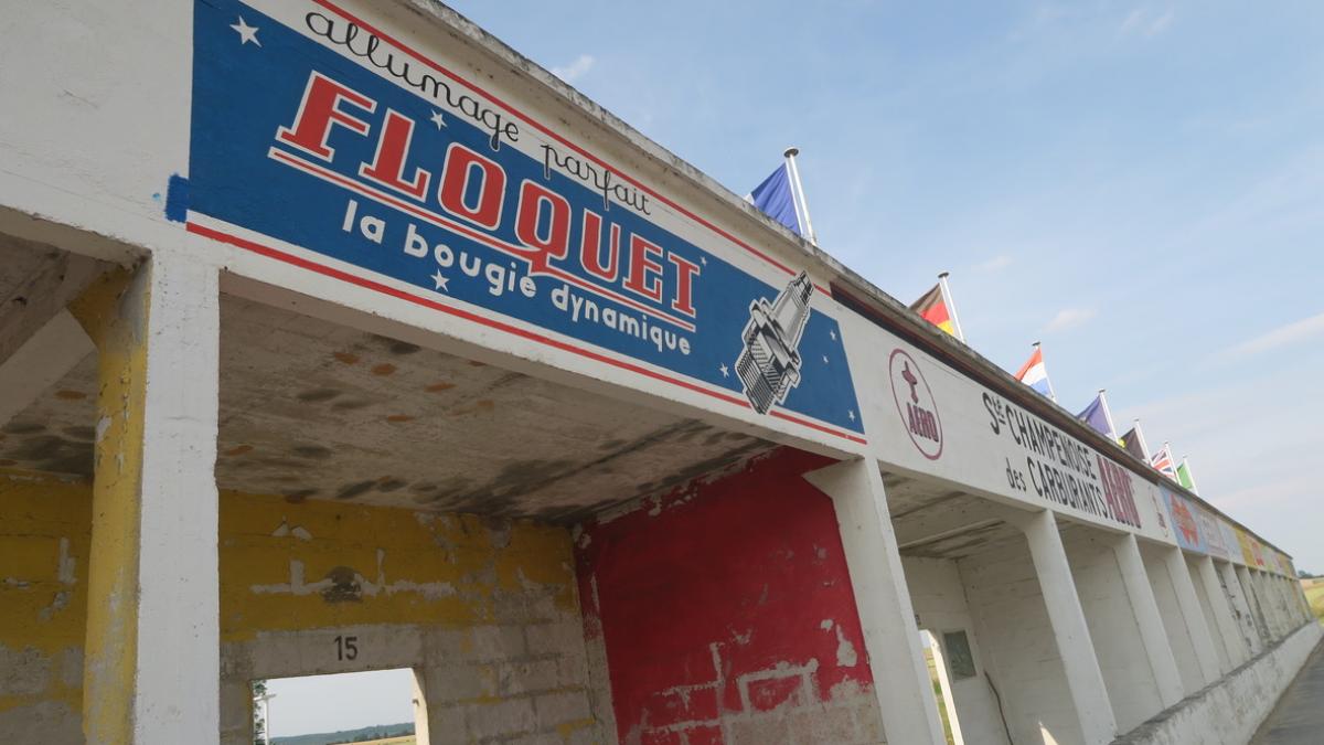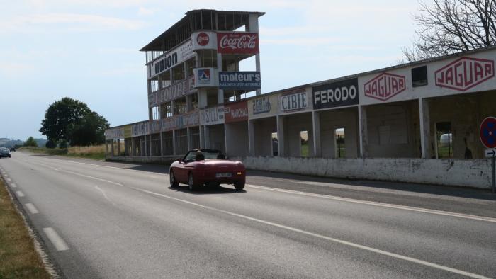 Direction sur le circuit de Geux, sa ligne droite (qui comme au Mans est une route départementale) et ses stands qui ont accueilli après guerre les grands prix de Formule 1 avec les pilotes Fangio, Trintignat, Moss etc.