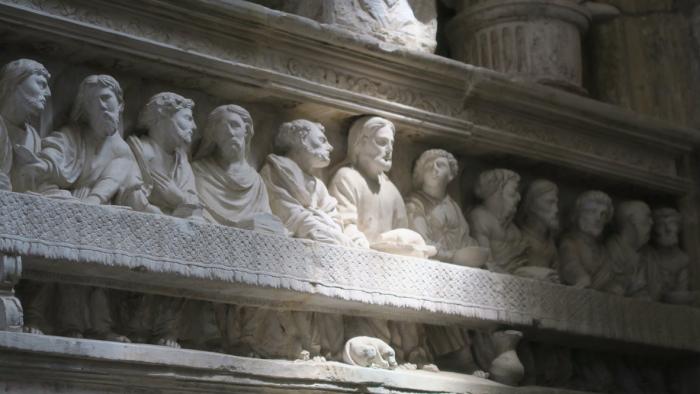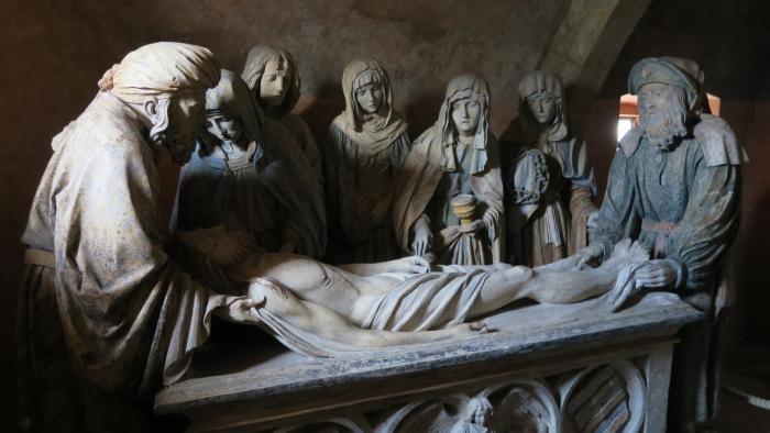 Nous somme allés visiter l' Église Saint Jean Baptiste érigée au 12 siècle et qui contient dans une chapelle souterraine une scène d'un réalisme saisissant : la représentation du Sépulcre , groupe de huit personnages sculptés en pierre polychrome et mis en valeur par une lumière diffusée par une seule ouverture