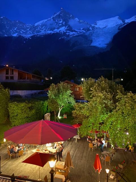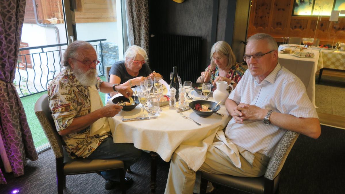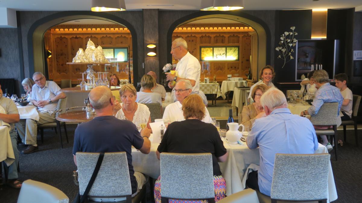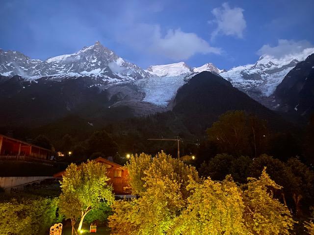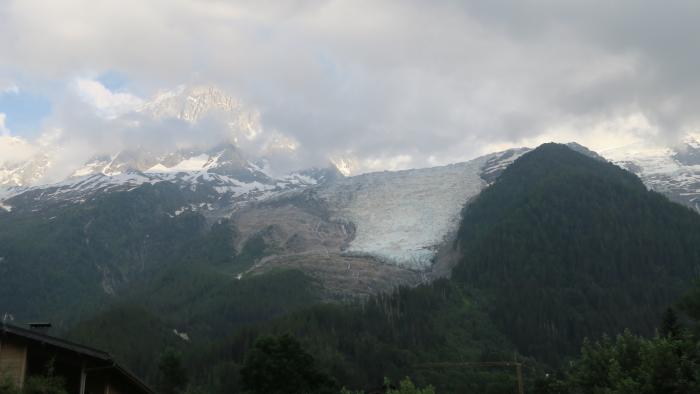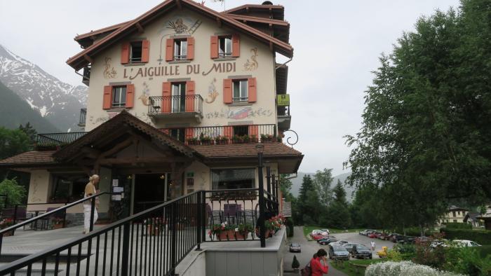 Arrivés en fin d'après midi dans notre Hotel de l'Aiguille du Midi aux Bossons, bel hotel typique avec  vue incomparable sur l'Aiguille de Midi, le glacier des Bossons  et le Mont Blanc.......... à condition  que les  nuages - bien souvent présents - ne nous en masquent pas le sommet :