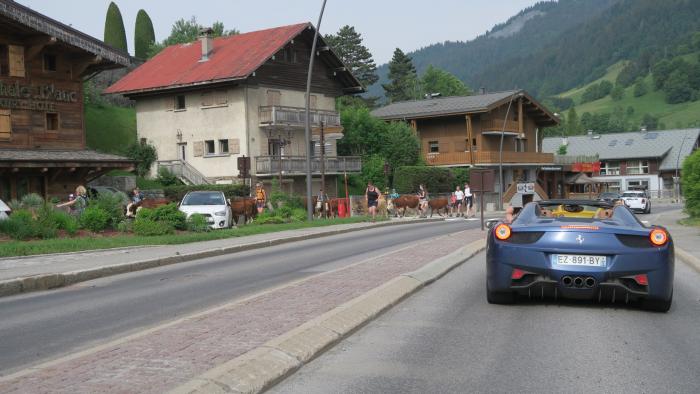 Au milieu d'un village, lorsque les  chevaux italiens croisent les vaches haut savoyardes :