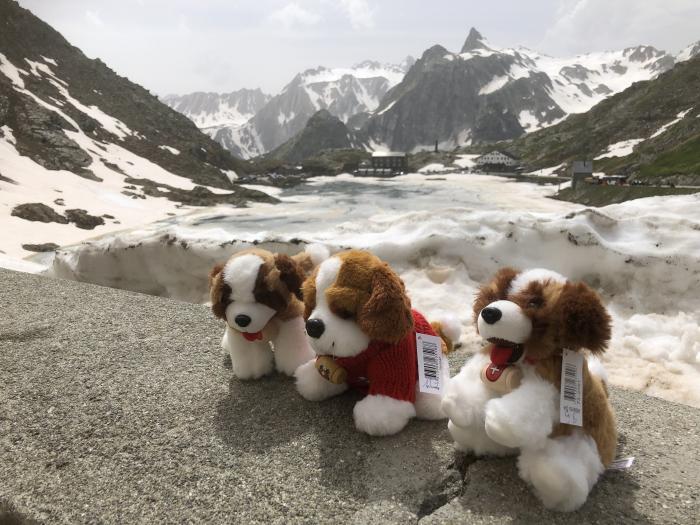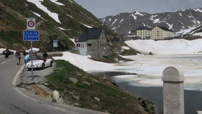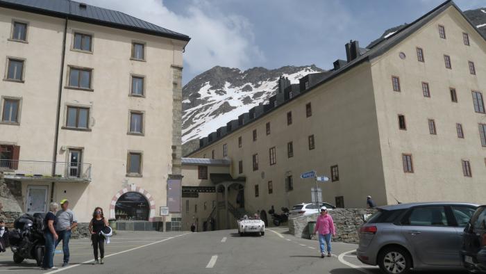L'arrivée au somment du col à 2473 mètres nous fait decouvrir l'Hospice du Grand-Saint-Bernard, tenu par les chanoines qui  accueillent  toute l’année randonneurs, pèlerins et hôtes de passage. La persistance du lac gelé en Juin met en évidence la grande rudesse du climat de ce lieu situé dans un cadre grandiose.