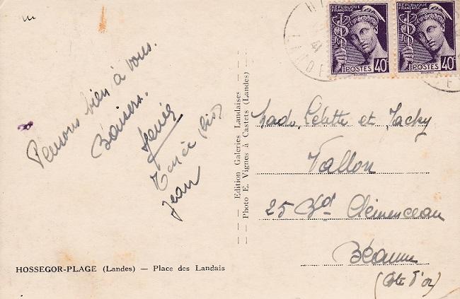 Alain Tribouillard nous a ouvert une fois de plus sa boite magique pour en extraire une carte postée en 1941 de Hossegor à son oncle et sa tante.